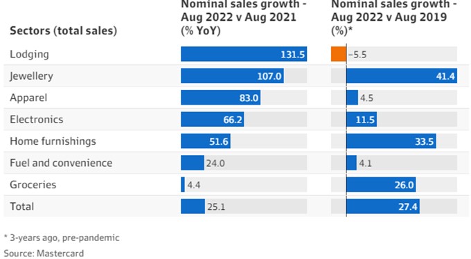The Australian economy is continuing to grow solidly, with consumer spending still high despite recent rate rises. Mastercard reported discretionary spending increased by more than 25% in September 2022, compared to the 12 months prior and pre-pandemic levels. The RBA hopes that a sharp rise in mortgage payments for many Australians will depress spending and bring inflation to heel.