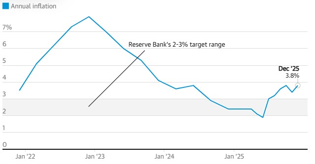 Australia’s annual inflation rate rose to 3.8% in December, up from 3.4% in November, with the result higher than economists had expected. This reflects a broader lift in price pressures across the economy and continues to show that inflation is proving more persistent than the RBA would like.