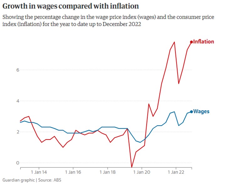 Despite the wage growth, high inflation means workers continue to go backwards in real terms. In the December quarter, consumer prices rose 7.8%, indicating real wages (adjusted for inflation) have declined by 4.5% over the last year.