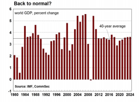 As highlighted in the chart below, it would appear that world economic growth is stabilising as the world’s GDP (Gross Domestic Product) levels move towards the 40 year average: