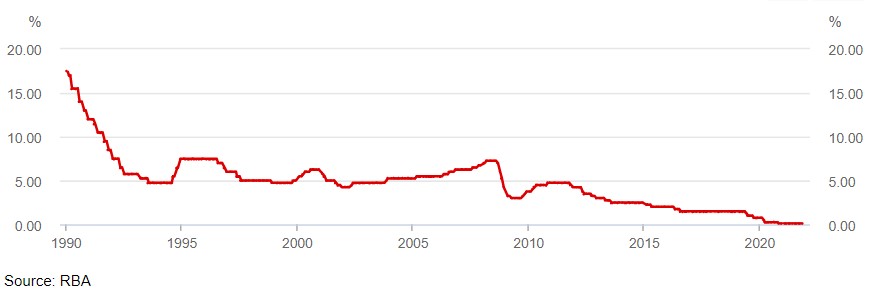 It seems hard to fathom now, but the RBA Cash Rate was 7.00% in September 2008. While the interest rate cuts at that time were amid the Global Financial Crisis, since then, we have seen a steady decline in interest rates to where we sit today at a record low of 0.10%. It has been held at 0.10% by the RBA since November 2020. Official cash interest rates have been below 1.00% since October 2019, now two full calendar years. I’m sure many investors long for the return of 7.00% p.a. term deposits, which now seem too good to be true!