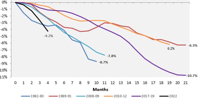 Residential property has benefited from the long-term downtrend in interest rates since the 1980s and now appears far more vulnerable to the reversal than in previous downturns. In the last 25 years, residential property price downturns have mostly been mild, with prices falling less than 10%, and these downturns have been brief, with prices quickly rebounding. This cycle appears different thanks to a combination of high household debt levels, high home price to income levels, an end to the long-term downtrend in interest rates and the elevated prices achieved during the pandemic.